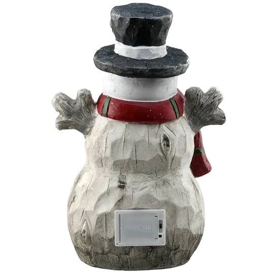 This decorative seasonal piece is constructed of strong polyresin material featuring handcrafted and hand-painted detail. This smiling snowman is wrapped in a cozy cap and scarf and features a wood-look design. Battery powered LED light shines from inside through cutouts in the body for a soft glow.