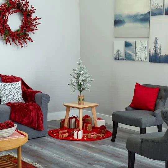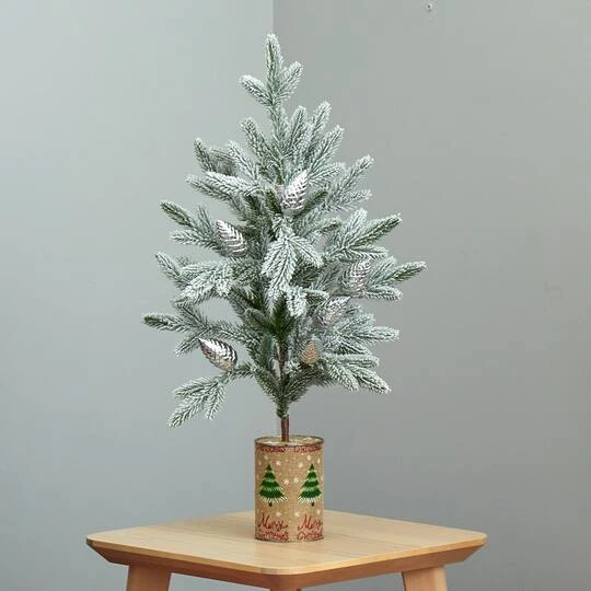 Evoke hints of the season with this flocked artificial Christmas tree. Maintenance-free, it features a naturally sparse design with slender bendable branches and finished with faux snow to evoke a winter-inspired setting. Standing just over 28’ tall stabilized in a decorative planter, it would make a merry addition to winter décor.