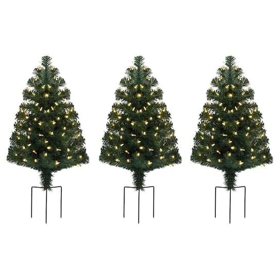 Mr. Christmas Alexa compatible Set of 3 Pathway Tree Lights. Each 31″ tree comes pre-lit with 70 lights. Alexa voice-activated lights with 12 lighting functions. Lighting your pathway, garden, or patio for the holidays has never been easier, and connecting to Alexa is as simple as plugging it in and using your voice, “Alexa, turn my Christmas lights on.” Customize your light strand to match your holiday décor; choose between an array of colors and fun functions to create a unique effortless display. This strand of 3 trees has 75″ between each tree and a 96″ lead cord.