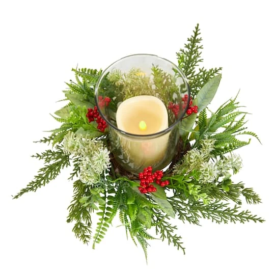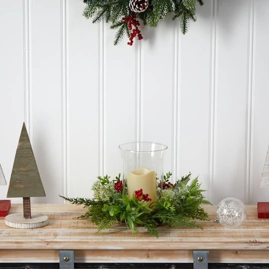 Create a cozy wonderland during the holidays with this Christmas candelabrum. Decorative yet, festive, soft-textured evergreens in different shades are accented by berries, inspired by nature and made from high-quality materials. Set the scene and add your favorite candle. With a height of 8″, add a seasonal touch wherever displayed. Your arrangement will look beautiful for years to come; simply wipe clean with a soft dry cloth when needed.