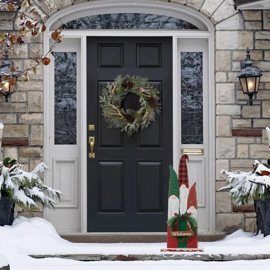 This charming Gnome family porch décor will make a great addition to your holiday theme. It features the word “Welcome” with a rattan wreath in front of baby gnome. This piece can be displayed as one porch decoration or detached into three separate items for multiple decorations. Made of durable wood, the family design gives a festival atmosphere.