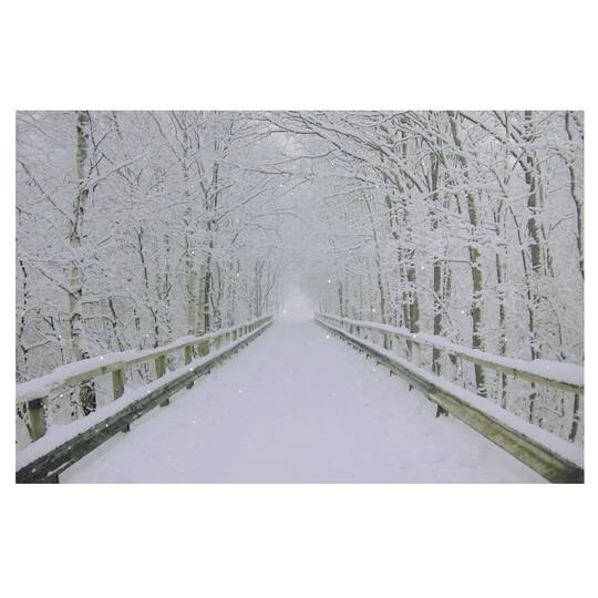 There’s something so pristine about freshly fallen snow. This winter scene depicts a snow covered wooden bridge among mighty snow dusted trees. Pre-lit with fiber optic pure white lights giving the illusion of falling snow.